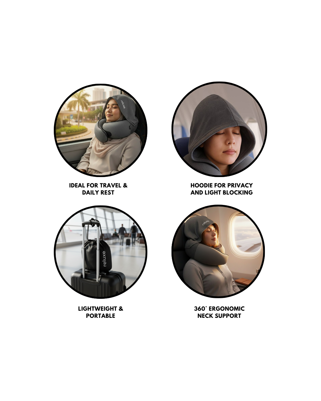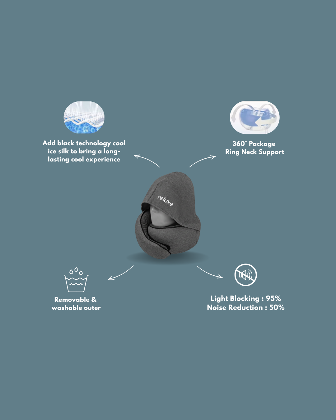Our signature Reluxe Hooded Neck Pillow delivers superior support, privacy, and comfort — perfect for travellers, commuters, and drivers who value both function and style.